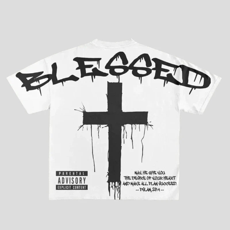 Unser Das Blessed Shirt verfügt über einen inspirierten Designerdruck. Es bietet eine ähnliche Ästhetik, ohne ein originelles Design zu sein.