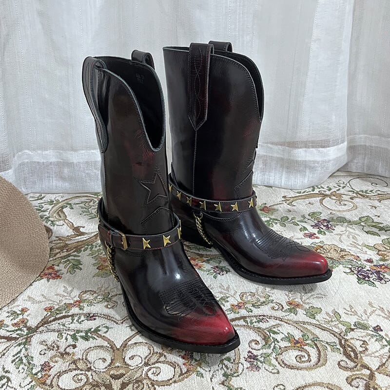Vreeo beginnt, den Westernstil auf so frische und tragbare Weise zu integrieren. Diese Westernstiefel sind aus 100 % hochwertigem Rindsleder gefertigt und haben eine Cowboy-inspirierte Form und einen geschichteten Kegelabsatz.