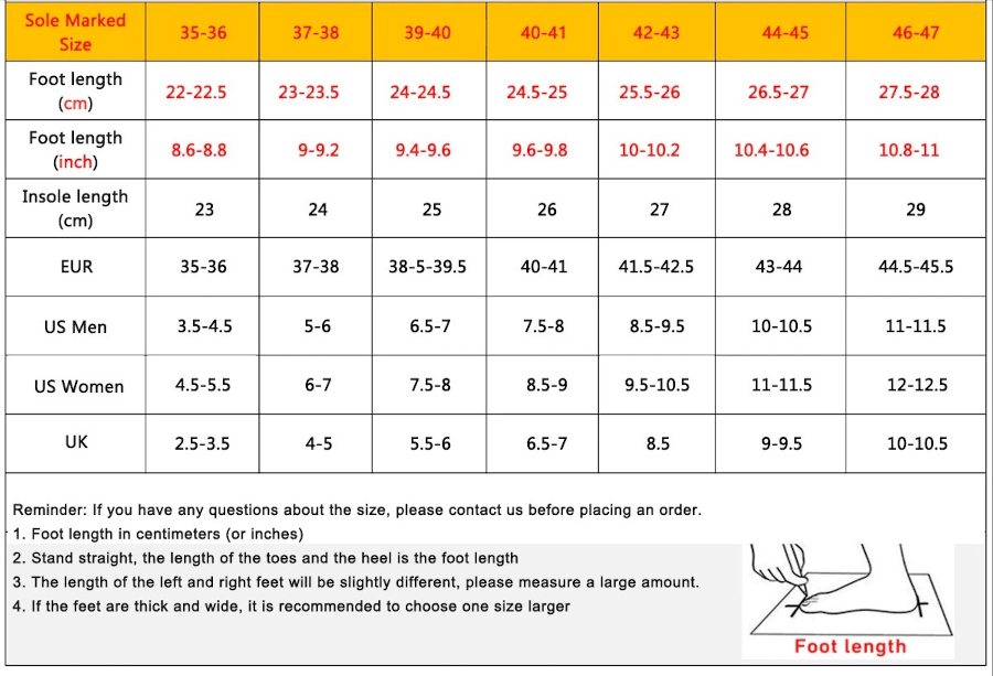 2. Wählen Sie die Größe basierend auf der gemessenen Länge. Hinweis: Unsere Schuhe können internationale Größen haben.