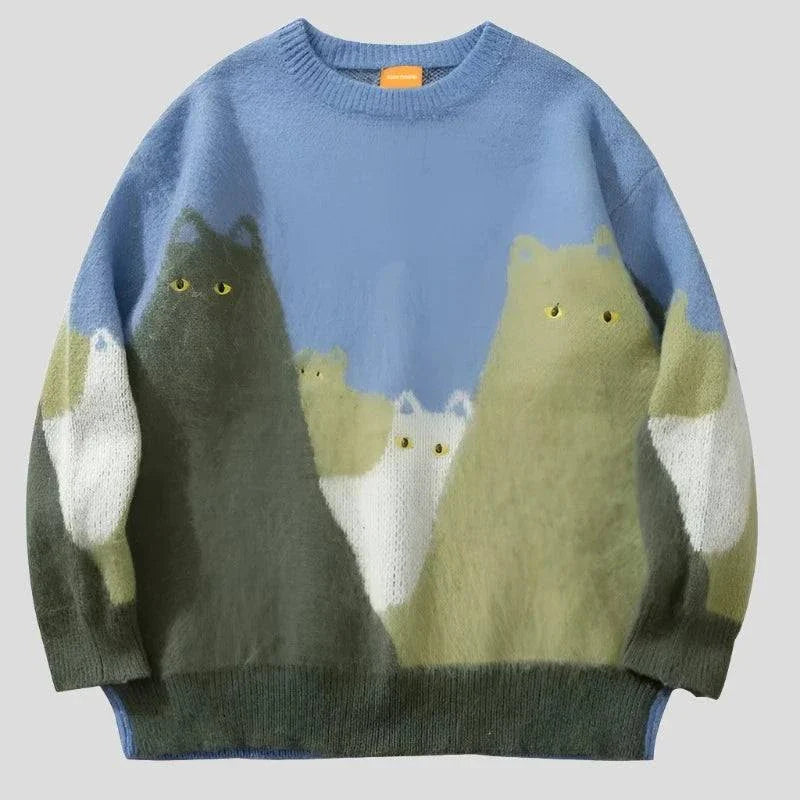Entdecken Sie die perfekte Balance aus Komfort und Stil mit unserem übergroßen Strickpullover für Herren. Dieser Pullover ist aus hochwertigen Materialien gefertigt und verfügt über eine verspielte Katzengrafik, die Ihrer Garderobe einen Hauch von Persönlichkeit verleiht. Die übergroße Passform sorgt für ein entspanntes und gemütliches Gefühl. Perfekt für jeden Anlass.