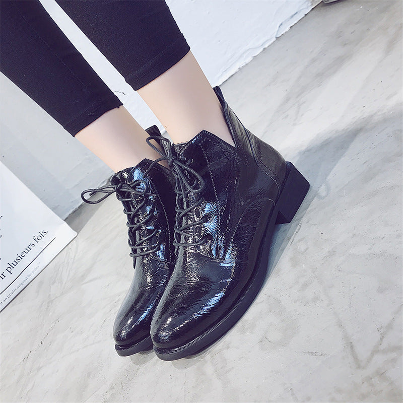 Kurze Stiefel aus Lackleder mit niedrigem Absatz