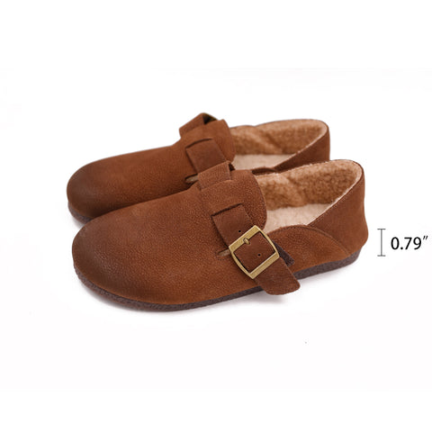 Retro-Design mit runder Zehenpartie. Obermaterial aus gebürstetem Nubukleder. Weiche und bequeme Gummisohle. Knöchelriemen mit Schnalle. Einfaches An- und Ausziehen. Natürlicher und frischer Stil.
