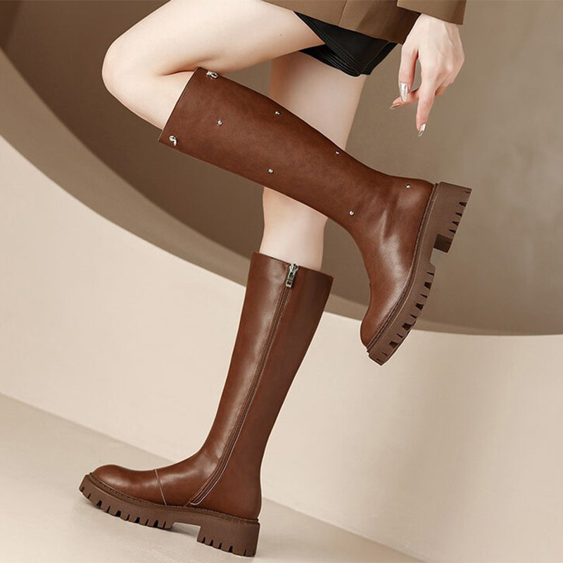 Kniehohe Lederstiefel im modischen Stil mit runder Zehenpartie, dicker Gummisohle und Nietendetails. Bequem und betont Ihre langen Beine.