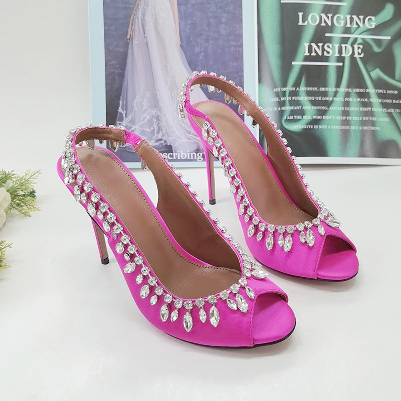 Kristallsandalen sind ein Must-have in Ihrer Garderobe und perfekt für besondere Anlässe. Sie haben eine offene Zehenpartie, ein Obermaterial aus Satin, ein Lederfutter, mit Kristallen verzierte Verzierungen und überzogene Stilettoabsätze.