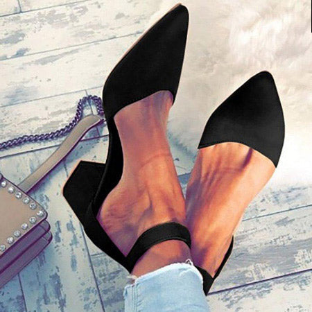 Damenschuhe mit klobigem Absatz, spitzer Zehenpartie und mittlerem Absatz.