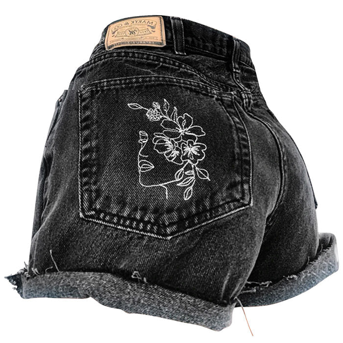 Estos clásicos pantalones cortos de mezclilla grunge de cintura alta presentan un bordado de contorno estético.