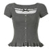 Esta blusa gris estética Coquette presenta una construcción suave con botones frontales, un inserto con estampado de lunares y un encantador detalle de lazo.