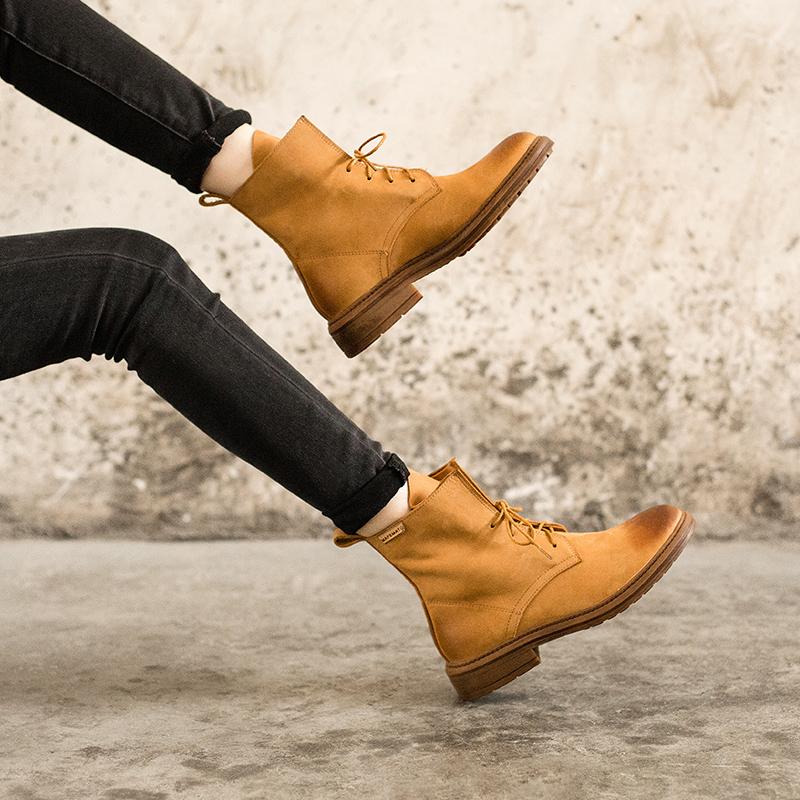 Dale un toque especial a la nueva colección con las botas militares para mujer de Vreeoshoes. El cuero amarillento de moda luce único en otoño e invierno.