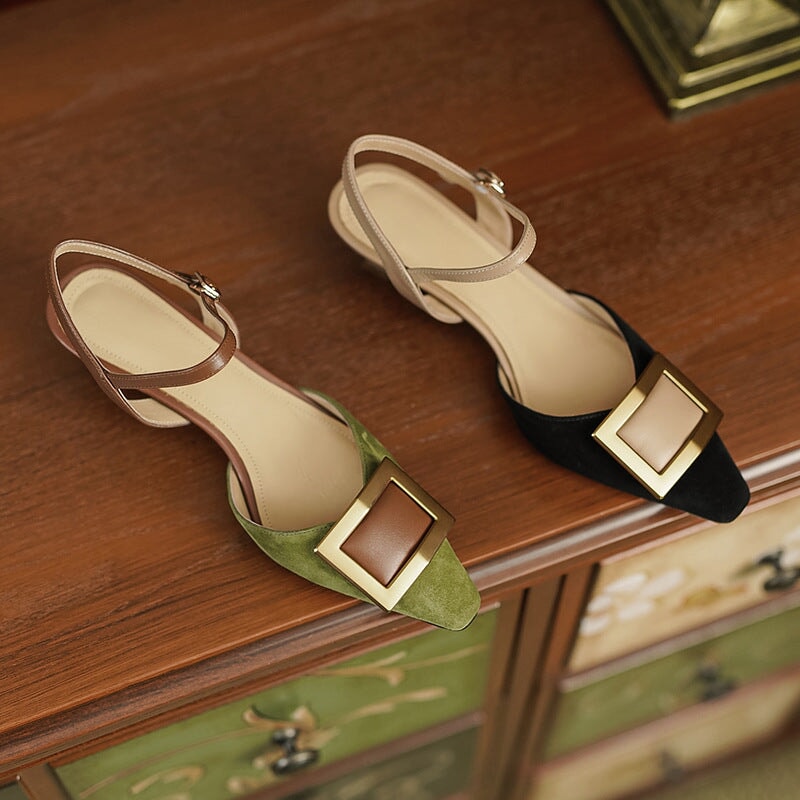 Detalle de hebilla cuadrada de metal. La parte superior y la plantilla están hechas de cuero de primera capa. Suaves, flexibles y cómodas. Cortadas a mano. Luce tu belleza única.