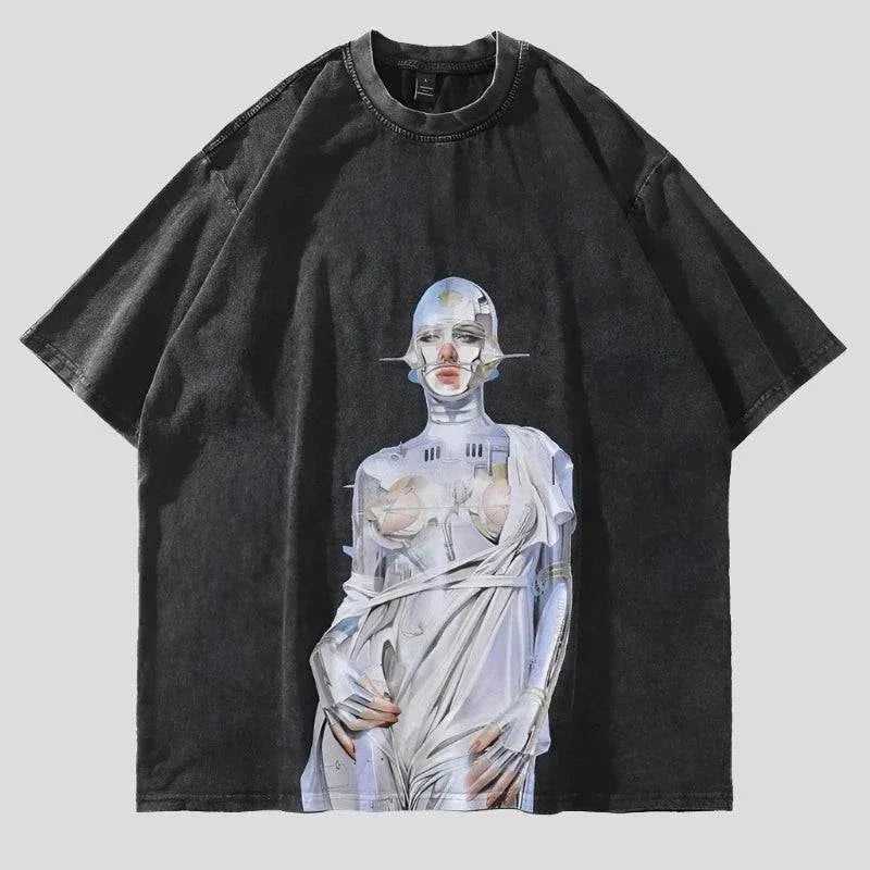 Saca tu lado más atrevido con nuestra camiseta oversize desgastada. Fabricada con materiales de alta calidad, esta camiseta presenta un estampado gráfico llamativo que le da un toque de personalidad a tu look. Su corte oversize ofrece máxima comodidad y un estilo moderno y natural. Renueva tu armario con esta prenda imprescindible.