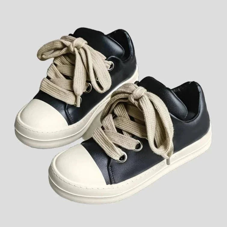 Step out in style with our Unisex Black Low Top Chunky Sneakers. These fashion-forward vulcanized shoes are designed for both comfort and trendiness. With their sleek black design. low-top silhouette. and thick shoelaces. these casual sneakers add a touch of urban flair to any outfit. Whether you're running errands or hanging out with friends. these versatile casual sneakers are the perfect choice. Elevate your footwear game with our Unisex Black Low Top Casual Sneakers today!
