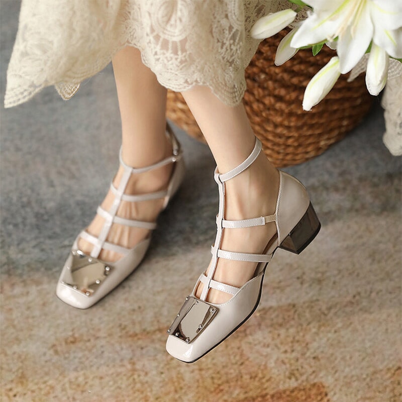 Square Toe with Metal decoration. Patent Leather Upper with smooth texture. Comfortable Rubber Sole. Convenient Buck Design. Hand-Cut. Retro Style.