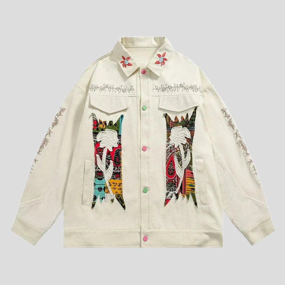 Our patchwork jacket features an inspired designer print. offering a similar aesthetic without being an original design.
