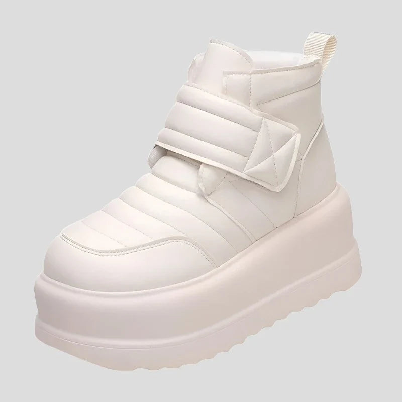 Introducing our Fashion Platform Boots for Women. perfect for the winter season. These snow boots feature a PU shaft and upper. combined with a rubber outsole for durability. The short plush insole and lining ensure warmth and comfort. Designed with a height-increasing heel (5cm-8cm) and a platform height of 3-5cm. these ankle boots offer both style and practicality. The round toe shape and shallow fashion element add to their chic look. Available in black and beige. these high-top boots come in sizes 35-39. Handcrafted with care. they feature a hook & loop closure for a secure fit. Ideal for leisure activities. these solid pattern boots are non-slip and provide excellent warmth. making them a must-have addition to your winter wardrobe. Choose our Fashion Platform Boots for Women for a blend of elegance and functionality.