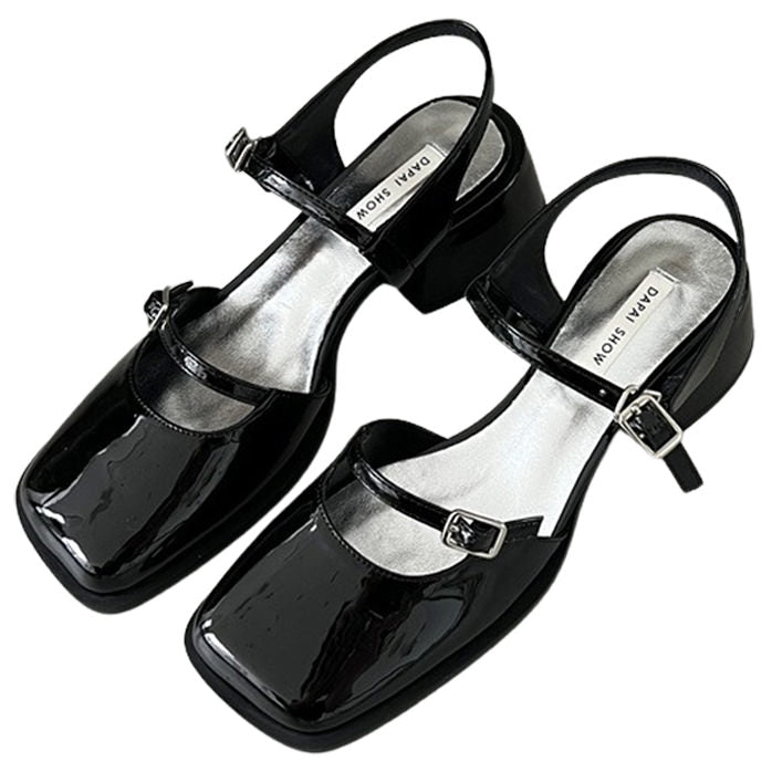 These Lovely Mary Jane Shoes feature a satin. vegan leather upper. a square toe. a comfortable block heel. and a buckle closure