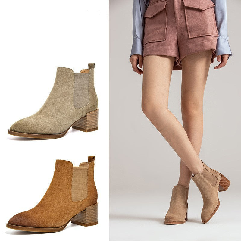 Fashion Style Western R Toe And Pull-On Style.Double Elastic At The Opening. Chunky Heel And Ankle-Length.Picked Suede Leather Soft.Comfortable And Stand Wear And Tear. Genuine Leather Lining Fit For Spring. Summer .Autumn And Winter Days.