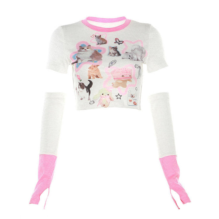 ThisTrendy Y2K-inspired crop top with kitten print and long contrasting glovesis the cutest addition to your wardrobe